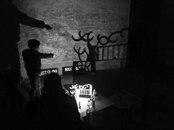 Millefeuilles is the magic of papercut, the charm of light and shadow, the wonder of little stories that come to life with the wave of a torchlight. Armed with their precious tool, young and old penetrate into a venue steeped in half-light. Following the light beams, an entire paper landscape unfolds, silhouettes appear, and scenes emerge that evoke dreamed and real life paths as well as precious and mundane moments.