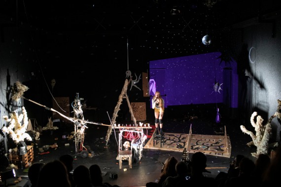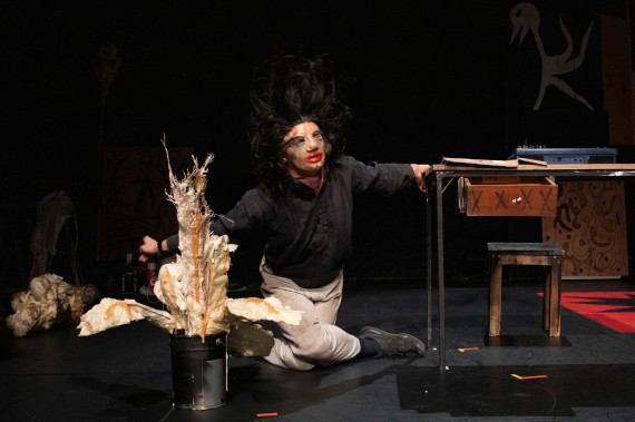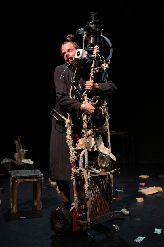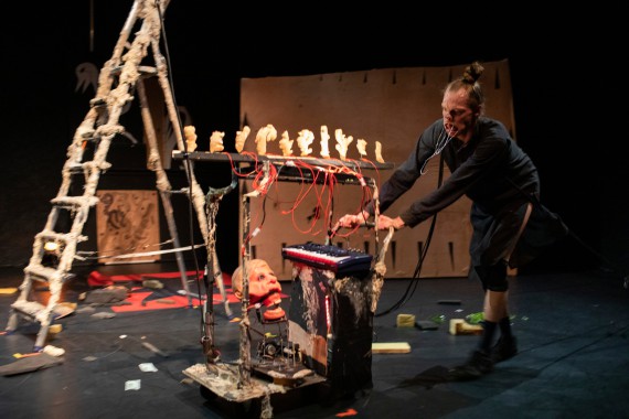 Entrer dans cette salle, c’est pénétrer l’antre de deux artistes géniaux et se laisser happer par leur bizarrerie, leur drôlerie et leur vitalité. Signé du plasticien Augustin Rebetez et du contorsionniste Niklas Blomberg, Voodoo Sandwich est un puissant antidote à la morosité ambiante, un cirque pour transformiste solo. Tour à tour squelette musicien, femme vampire et DJ bonimenteur, le Finnois se métamorphose à l’envi, usant d’objets improbables pour déformer son corps et de racines de gingembre pour créer de la musique.